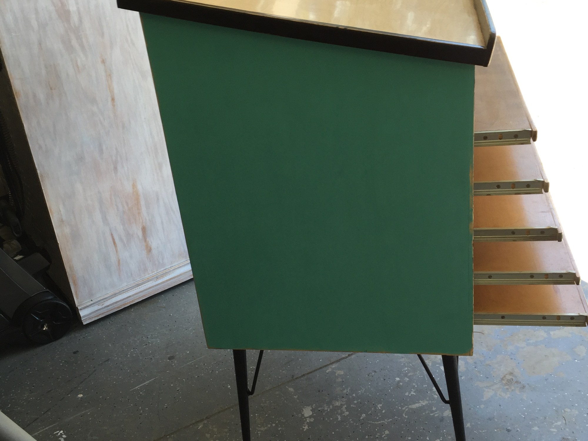 Unique 1950’s wood and metal drafting table. Multiple sliding trays ideal for crafting or painting supplies!